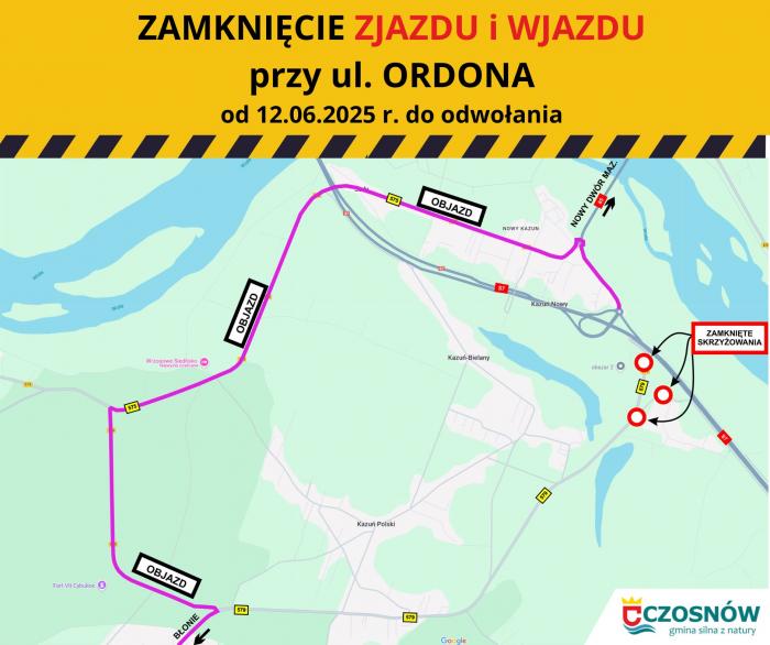 Zamknięciu ulegnie wlot skrzyżowania drogi wojewódzkiej nr 579 (DW579) do drogi krajowej nr 7 (DK7) w rejonie węzła Nowy Dwór Mazowiecki, obejmujący ulice Fort Ordona i Rekreacyjną w miejscowości Kazuń Polski. Oznacza to ograniczenia w płynności lokalnego ruchu dla mieszkańców w tym rejonie. Zamknięcie zjazdu i wjazdu przy ulicy Ordona potrwa do odwołania.