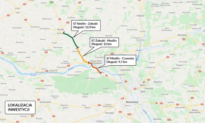 Modernizacja trasy S7 Płońsk - Czosnów przebiega w większości po istniejącym śladzie. Trasa rozpoczyna się na połączeniu z ekspresową obwodnicą Płońska w km 300+000, za istniejącym węzłem Siedlin na przecięciu dróg krajowych nr 7 i nr 10. Koniec trasy znajduje się w miejscowości Czosnów, jako dowiązanie do projektowanego w ramach odrębnego zamówienia węzła Czosnów. Dodatkowo inwestycja dotyczy nowego przebiegu drogi krajowej nr 62, zlokalizowanej w rejonie węzła Ostrzykowizna w ciągu projektowanej drogi S7.