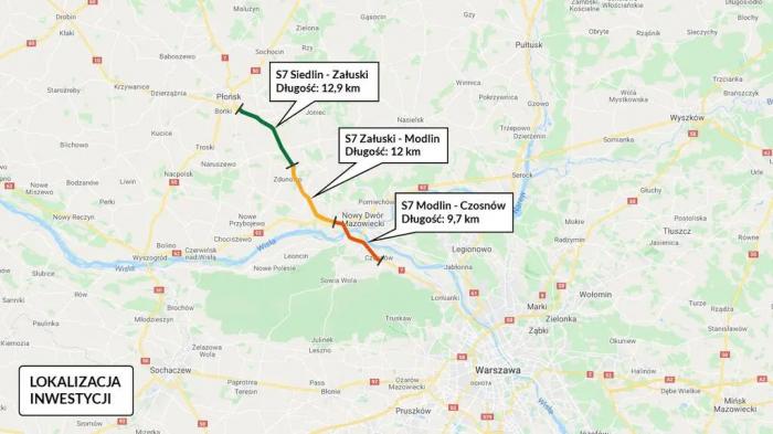 Trwa rozbudowa drogi krajowej nr 7. Prace są prowadzone na trzech odcinkach: Płońsk Południe-Załuski, Załuski-Modlin oraz Modlin-Czosnów. Najbardziej zaawansowane prace są na odcinku Modlin-Czosnów, który jest gotowy w 82 procentach. Odcinek Płońsk Południe-Załuski, mimo że ma najkrótszy termin oddania (maj 2025), jest w najgorszym stanie, z zaawansowaniem prac na poziomie 66 procent. Dla pozostałych dwóch odcinków terminy zostały wydłużone do sierpnia 2025 roku.