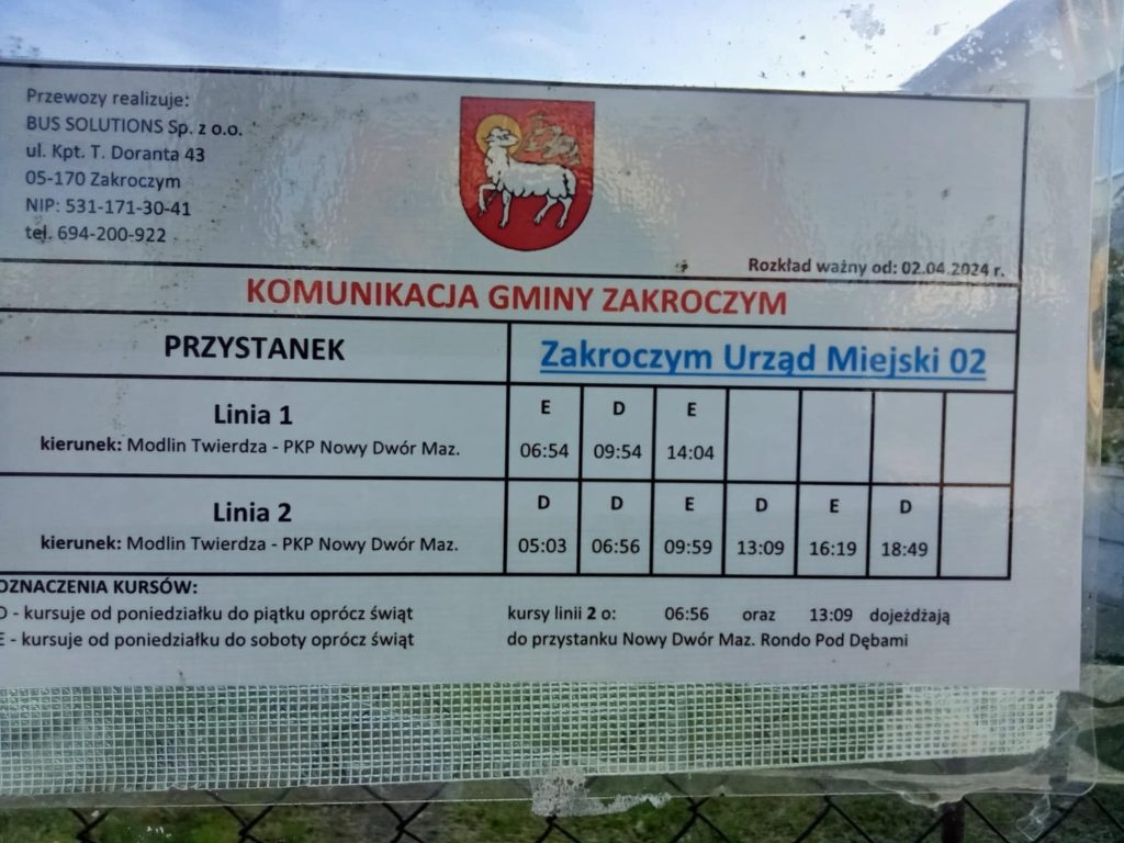 Niestety dzisiaj nie udało nam się w tej kwestii porozmawiać z burmistrzem gminy, który obecnie zwołał sztab kryzysowy w związku ze skażeniem wody w wodociągu Gałachy-Prochownia. Na zdjęciu powyżej przedstawiamy aktualny rozkład jazdy autobusów. Dodatkową formą, oprócz autobusów dowożących dzieci do szkół są busy, które transportują pracowników do fabryk, działających na terenie Nowego Dworu Mazowieckiego. Jeżeli poprosimy kierowcę takiego busa o podwózkę do NDM, być może się zlituje, co pozwoli uniknąć trzygodzinnego oczekiwania. Po 19.00 miejskie autobusy z Zakroczymia do Nowego Dworu nie kursują wcale.