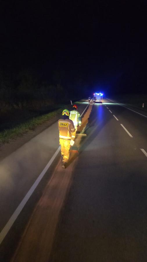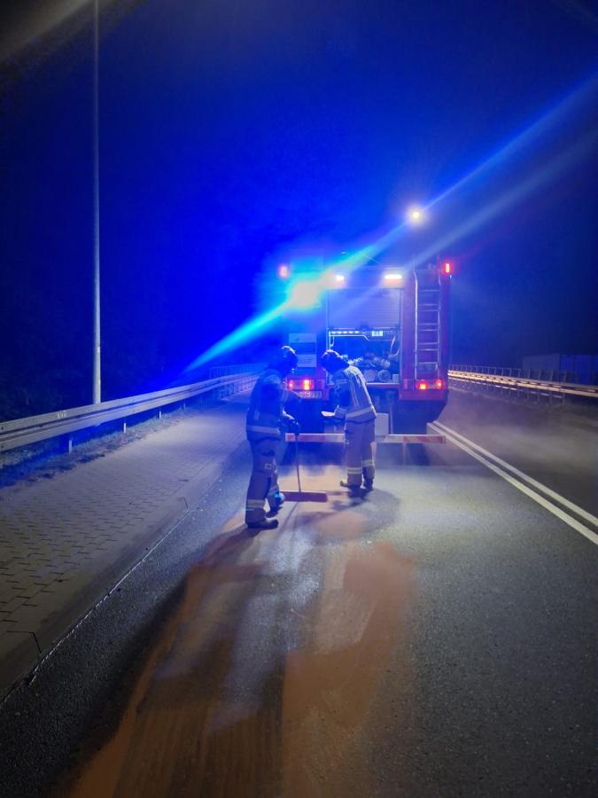 Na obwodnicy Nowego Dworu Mazowieckiego służby ratownicze interweniowały, by usunąć 5-kilometrową plamę oleju. Po dwóch godzinach akcji i zużyciu 420 kg sorbentu, udało się oczyścić miejsce zanieczyszczenia. Niemniej nie udało się zlokalizować pojazdu, z którego olej wyciekł. Zdjęcia z akcji - KP PSP w Nowym Dworze Mazowieckim/OSP Ratownictwo Wodne.