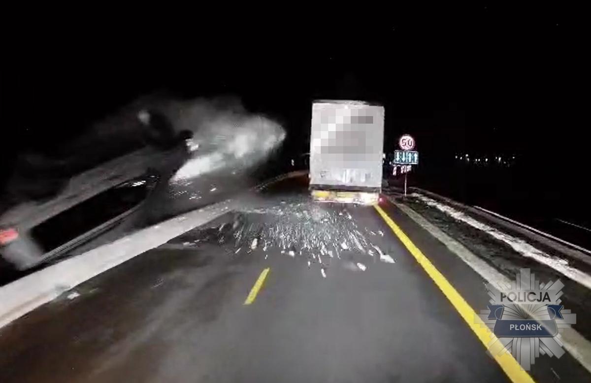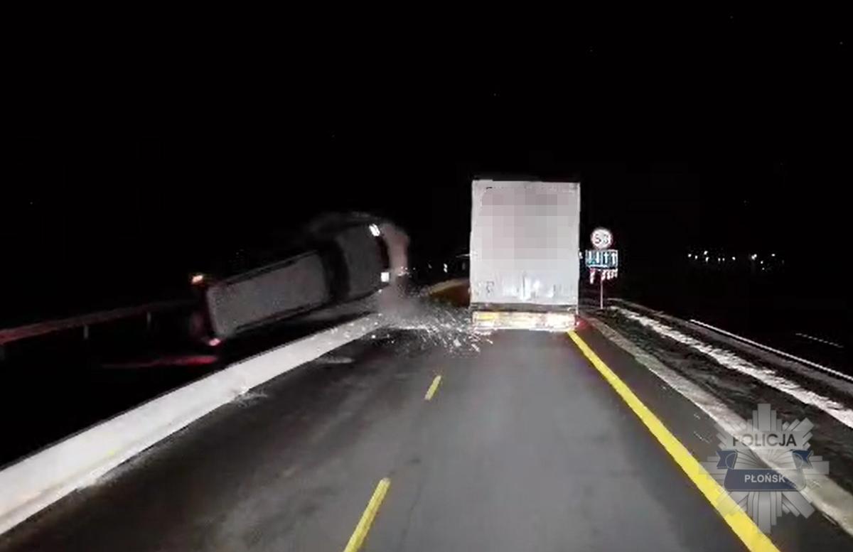 Widoki z miejsca zdarzenia oraz pojazdy zaangażowane w kolizję na drodze S7, gdzie 51-letni kierowca stracił panowanie nad pojazdem i uderzył w bariery. Mitsubishi, po gwałtownym manewrze, potrącił pięć pojazdów, w tym ciężarówki i seat. Na szczęście nikt nie ucierpiał, a wszystkie osoby były trzeźwe. Policja zauważyła, że jeden z kierowców ciężarówki był pozbawiony wymaganych uprawnień, co skończyło się na mandacie oraz punktach karnych dla sprawcy. Apel policji skierowany jest do wszystkich użytkowników drogi S7 o zachowanie szczególnej ostrożności ze względu na trwające roboty budowlane i zmiany w organizacji ruchu.